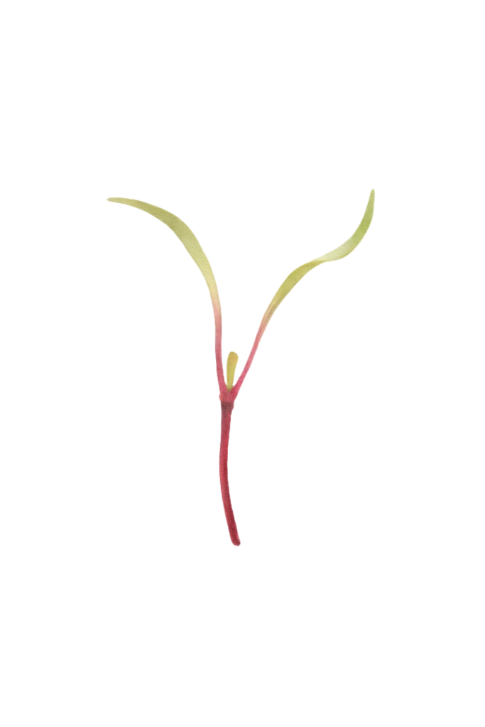 ビーツのマイクロリーフは、深みのある赤紫色の葉と鮮やかな赤い軸が印象的な品種です。ビーツ特有のほのかな甘みと土っぽさを幼葉のかたちで凝縮しており、料理に豊かな色彩と独特の風味をもたらしてくれます。