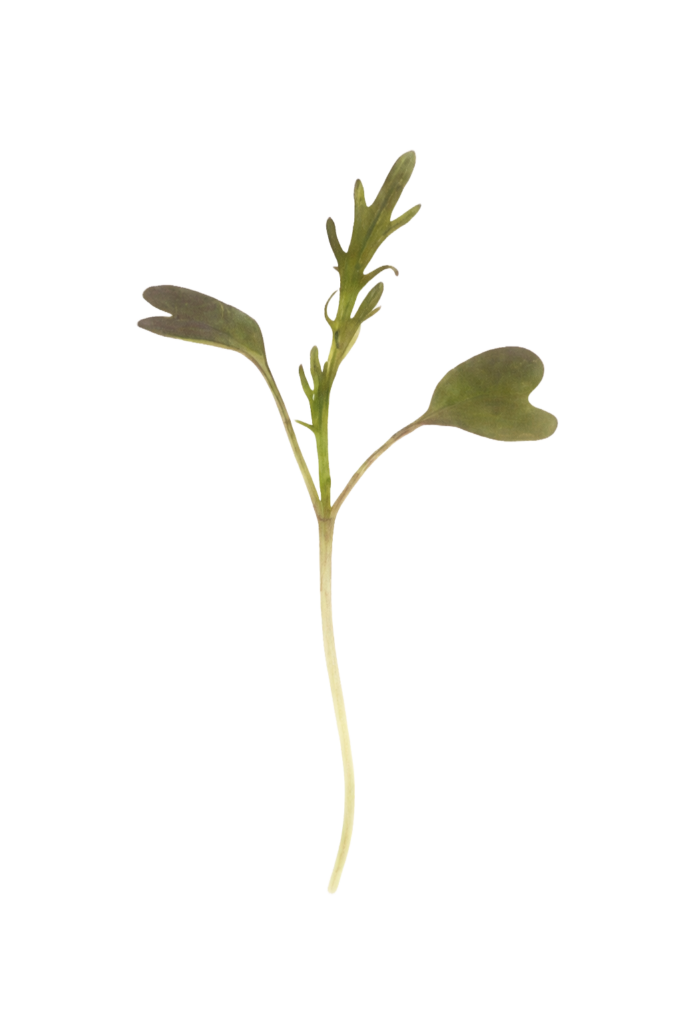 マスタード(赤)は、深みのある赤紫色の葉と、緑に比べてより力強い辛みが特徴のマイクロリーフです。色と香りの両面で存在感を放ち、料理に個性と華やかさを同時にもたらしてくれます。