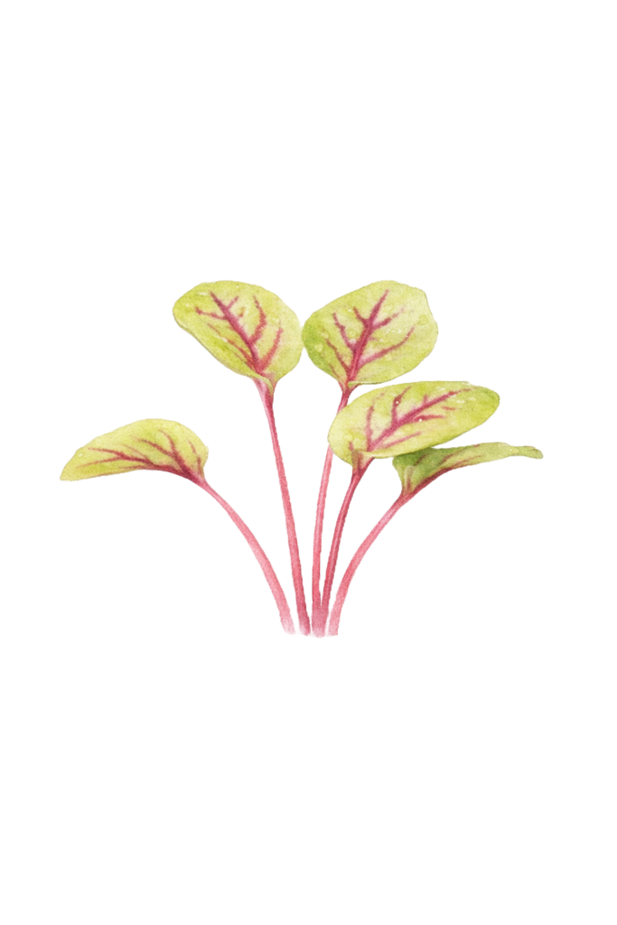 レッドソレルは、鮮やかな赤い葉脈と緑の葉が織りなす美しい見た目と、レモンを思わせる爽やかな酸味が特徴のマイクロリーフです。視覚的な華やかさと独特の風味を兼ね備えており、料理に上品な個性をもたらしてくれます。